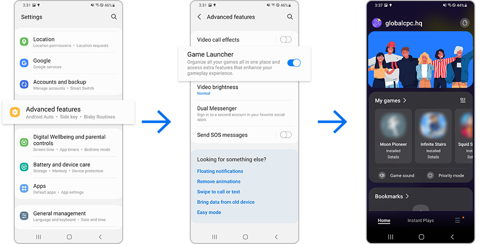 گیم لانچر اپلیکیشن مرکزی مدیریت بازی های سامسونگ است که بازی ها را در یک پوشه واحد جمع می کند، اعلان ها و تماس ها را هنگام بازی مدیریت می کند و به گیم بوستر دسترسی می دهد. فعال بودن گیم لانچر، دسترسی به برخی امکانات گیم بوستر را ساده تر می کند.