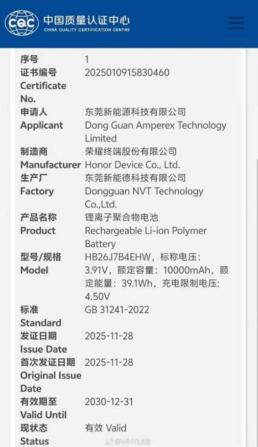 طبق دادههای رسمی CQC با شماره گواهینامه 2025010915830460، آنر X80 دقیقاً با همین ظرفیت عظیم تأیید شده است. این یعنی دیگر صحبت از حدس و گمان نیست؛ این گوشی وارد مرحله عرضه قریبالوقوع شده و باتری ۱۰ هزار میلیآمپرساعتیاش رسمی است.