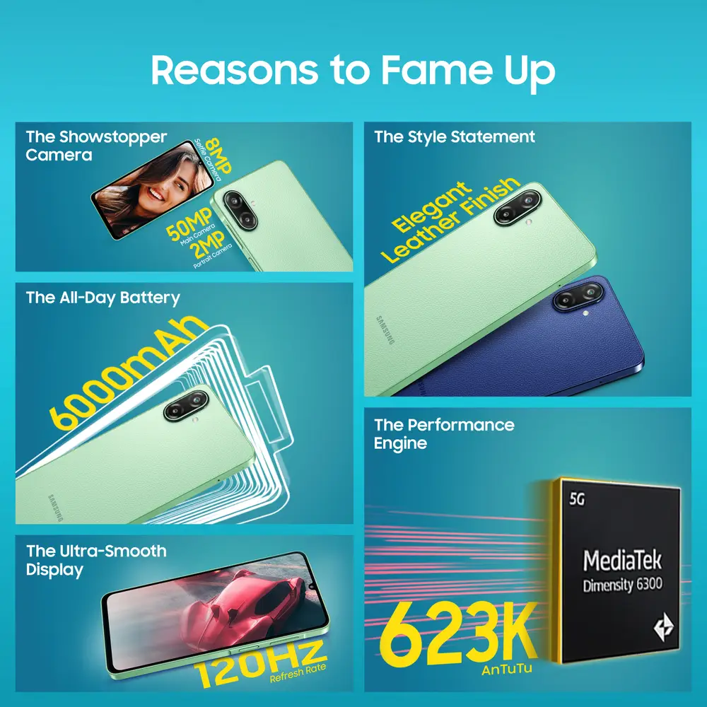 Samsung Galaxy F70e 5G با باتری 6000mAh، پردازنده Dimensity 6300، نمایشگر 120Hz و 6 سال آپدیت نرمافزاری، یک گوشی اقتصادی و قابل اعتماد برای استفاده طولانیمدت است.